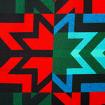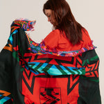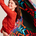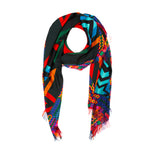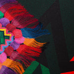Pañuelo Pierre-Louis Mascia en seda natural. Estampado geométrico multicolor, rojo, verde, turquesa, negro, amarillo, sobre verde oscuro. Composición: 100% seda . Desflecado medio. Tamaño: 135 x 195 cm. Hecho en Italia.