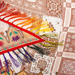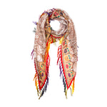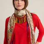 Pañuelo Pierre-Louis Mascia en seda natural 100% con forma romboide. Estampado imitación guipur en color crudo sobre fond nude. Rematado con flecos multicolor. Tamaño: 100 x 100 cm. Hecho en Italia.