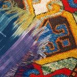 Pañuelo Pierre-Louis Mascia en seda natural. . Estampado ikat y arabesco, en tonos, verdes, mostaza, azul ,pistacho y coral . 100% seda. Desflecado medio. Tamaño: 135 x 195 cm. Hecho en Italia.