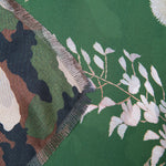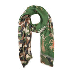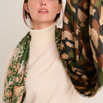 Pañuelo de seda de Pierre Louis Mascia doble faz. Combinación de estampado de vegetación en tonos verdes,arena y tostado , con camuflaje. Composición: 100% seda. Medidas: 65x190 .Hecho en Italia.