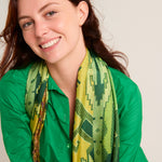 Pañuelo de seda de Pierre Louis Mascia doble faz. Combinación de estampados étnicos en tonos verdes,pistacho,mostaza y amarillo por un lado y pistacho,maquillaje,azul y naranja ,por el otro. Composición: 100% seda. Medidas: 65x190 .Hecho en Italia.