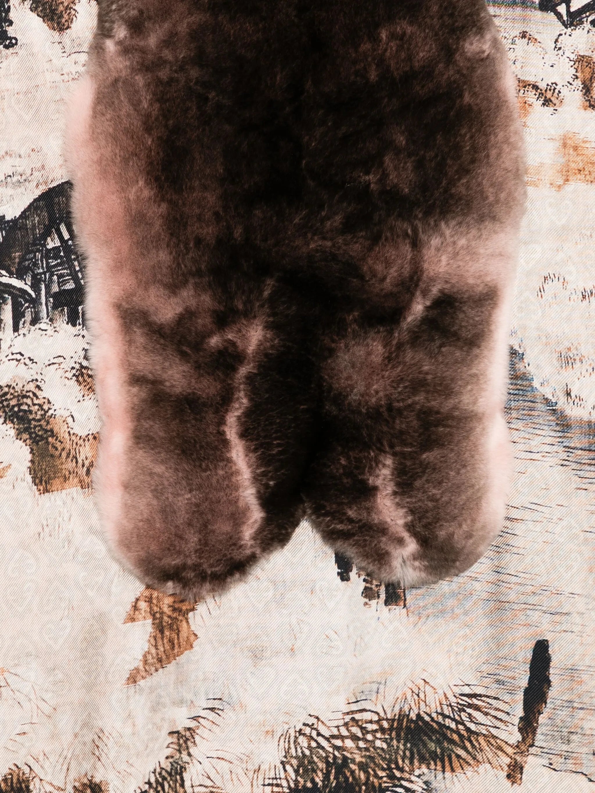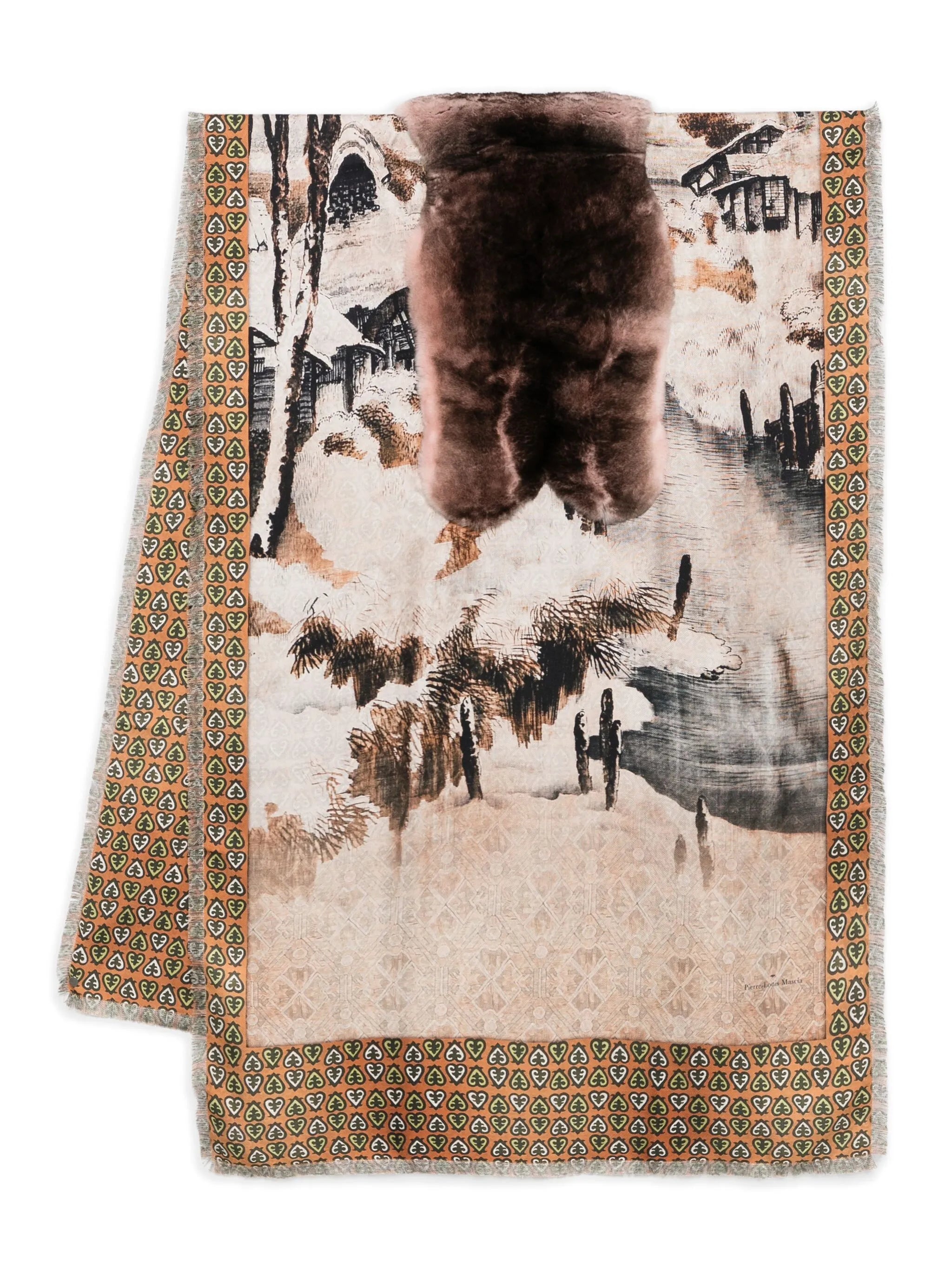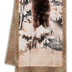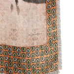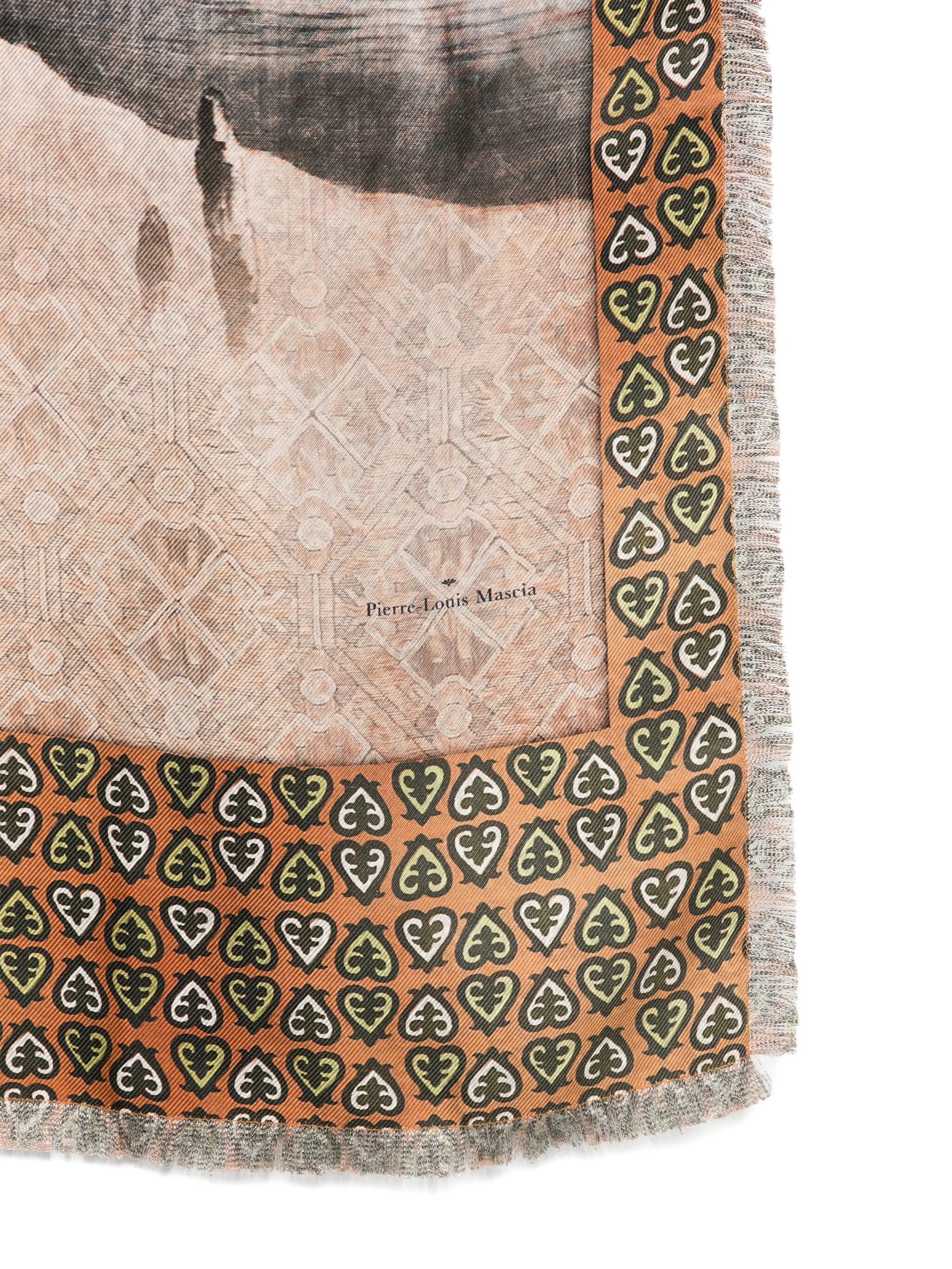 Pañuelo de la firma Pierre-Loius Mascia en seda natural 100%. Estampado abstracto y geométrico en marrón, camel y beige. Doble faz. Pieza central en piel ORYLAG en color marrón y rosa. Reverso geométrico en camel, negro y crudo. Remate fleco pequeño. Tamaño: 65 x 90 cm. Composición: 100 % seda, 100% ORYLAG. Hecho en Italia.