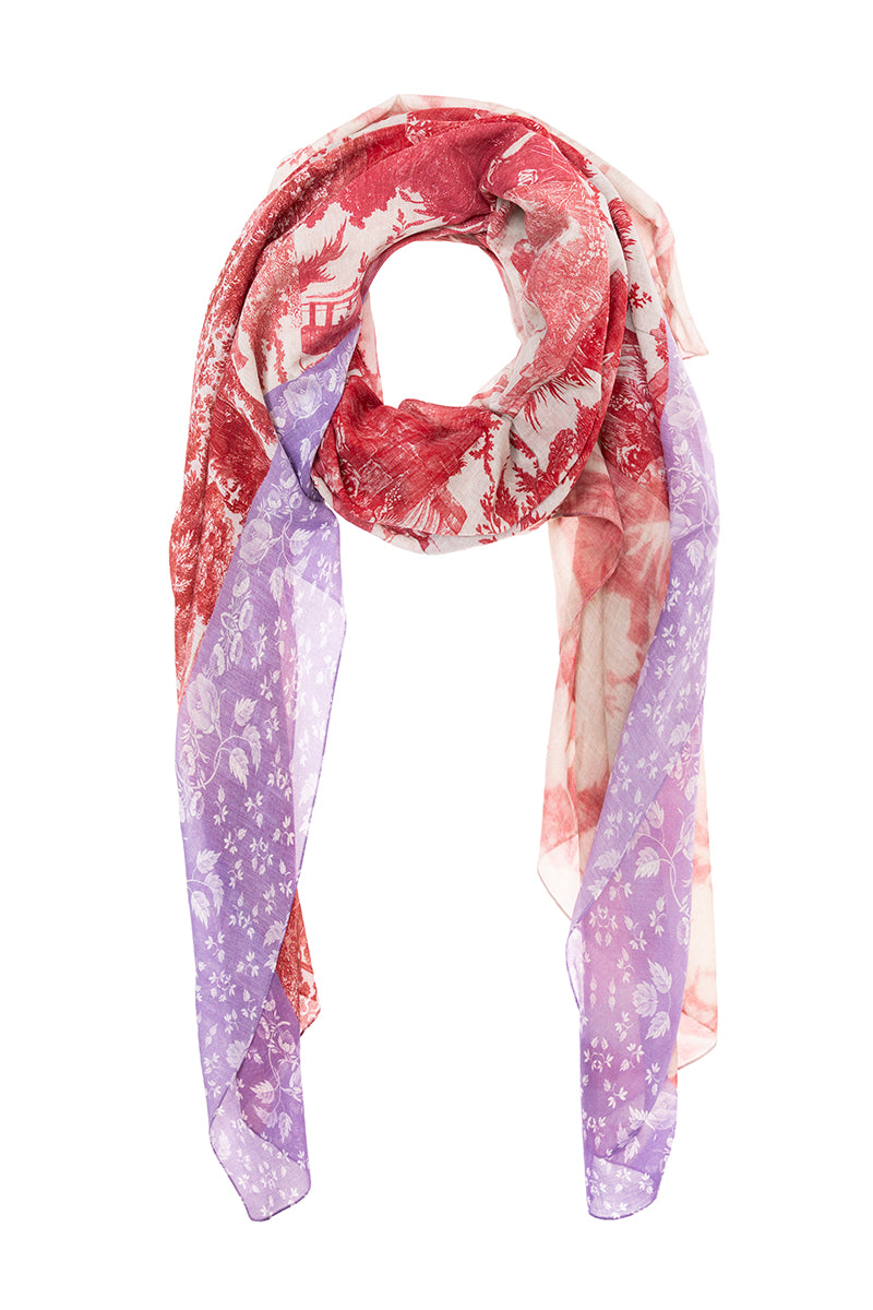 Pañuelo Pierre-Louis Mascia . Estampado toile de Jouy en tonos granates y morado Composición: 73% algodón, 27% seda. Tamaño: 135 x 190 cm. Hecho en Italia.