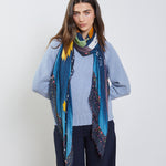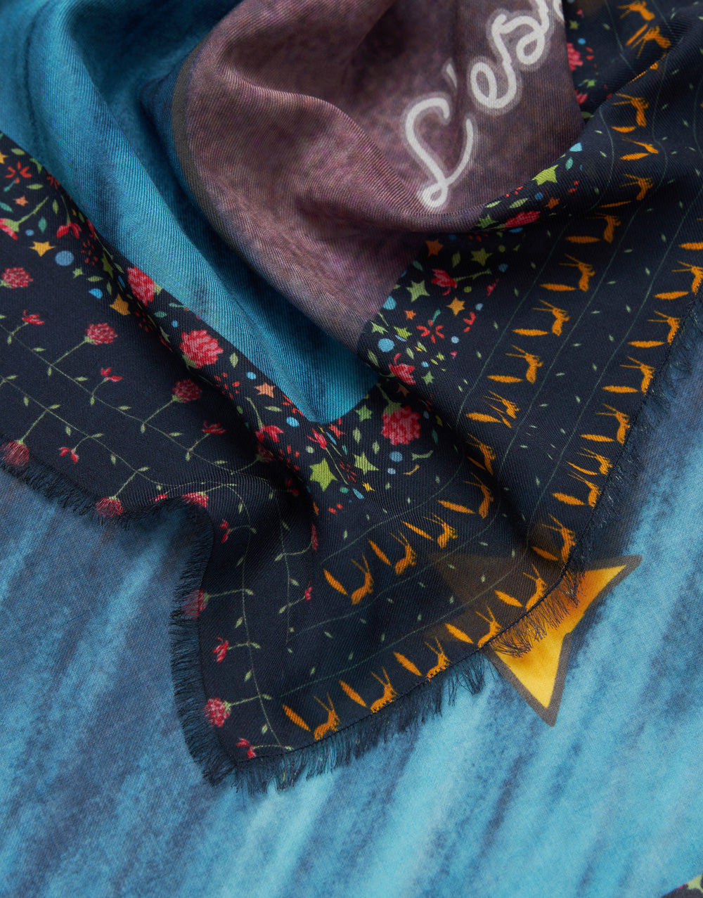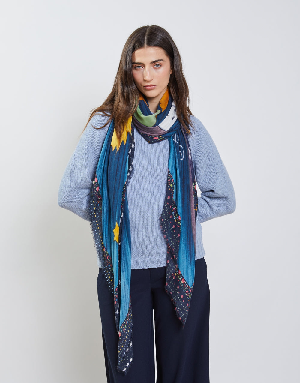 Pañuelo de la marca italiana Faliero Sarti modelo "Invisible" de la cápsula dedicada al cuento de hadas de Antoine de Saint-Exupéry, El Principito, publicado por primera vez en 1943. El estampado es un homenaje a la imaginación, la fantasía y el mundo fantástico narrado en la historia. Hecho en Italia. Composición: 90% modal, 10% cashmere.Tamaño: 140x145.