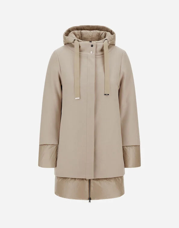 Chaqueta acampanada de la firma Herno, de sarga de 100 % lana virgen peinada bicolor.Acabada con detalles en el icónico Nylon Ultralight, la expresión más auténtica del estilo de Herno. Una tecnología exclusiva que contempla la elección del nailon japonés de 20 deniers y un sofisticado plumón 90/10 inyectado para brindar una sensación aún más ligera. El resultado es una buena resistencia al agua con un efecto parecido a la seda muy suntuoso al tacto. Corte asimétrico, capucha con cordón de ajuste, cierre cubierto con cremallera bidireccional y botones automáticos.