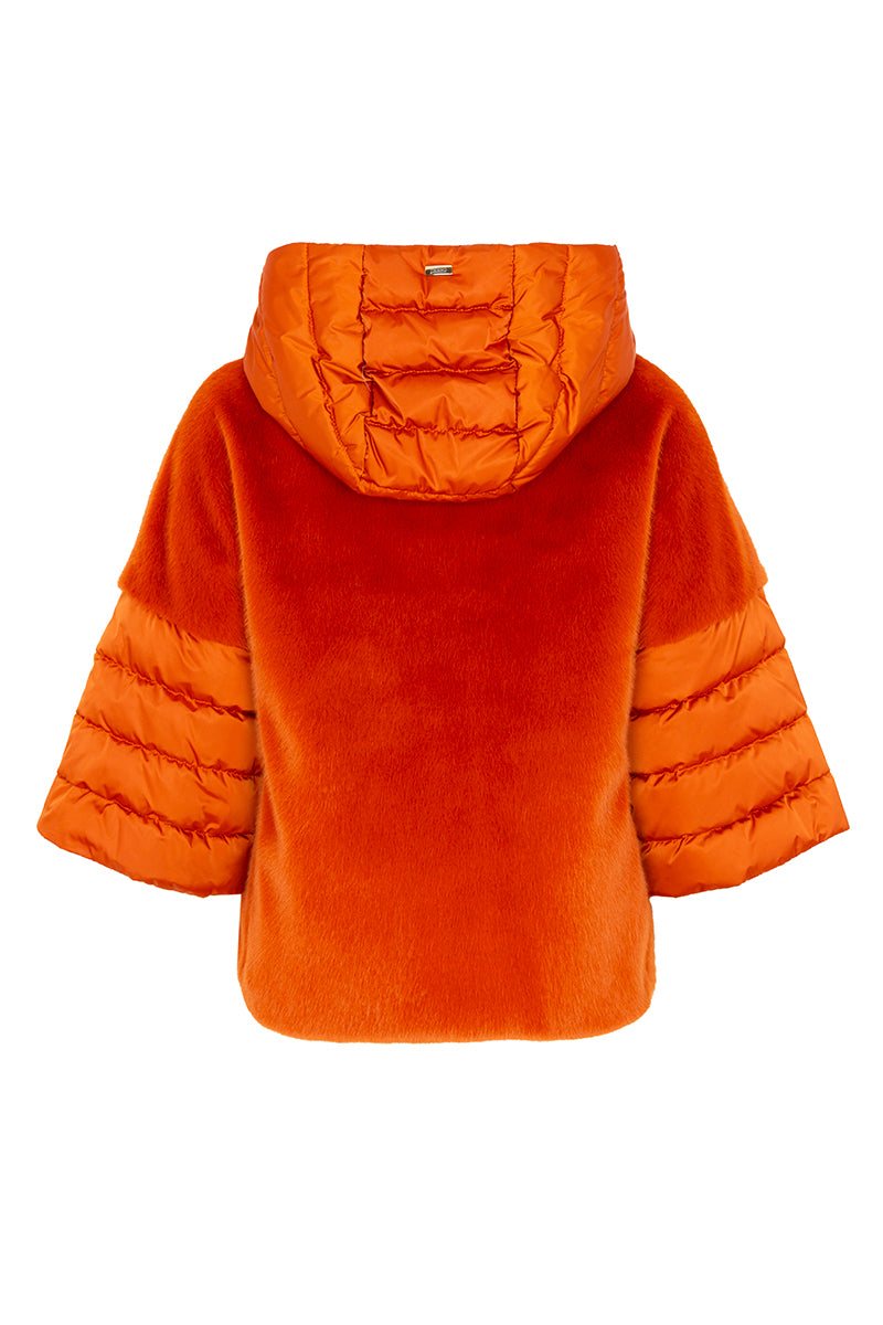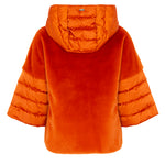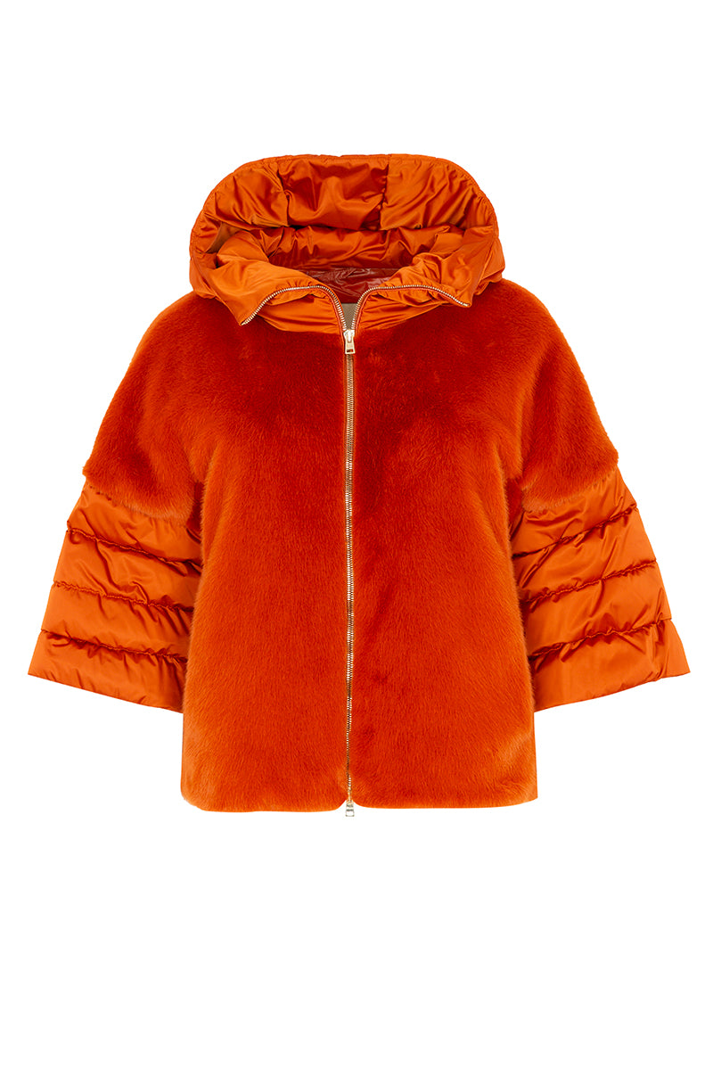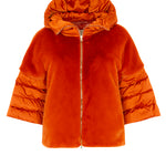 Chaqueta corta de pluma de ganso ultra ligera, de la firma italiana Herno. Combinación de ecofur con acolchado clásico . Manga francesa , capucha ,bolsillos laterales y cierre con cremallera de doble cursor. Color naranja quemado . Composición: 100% poliéster . Interior : 80% ,piumino, 20% pluma . PI002132D. Tallaje italiano .