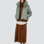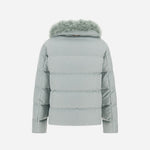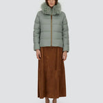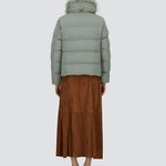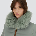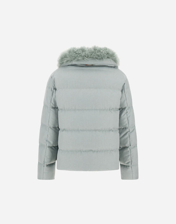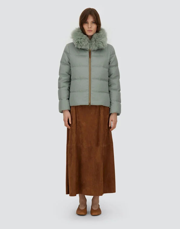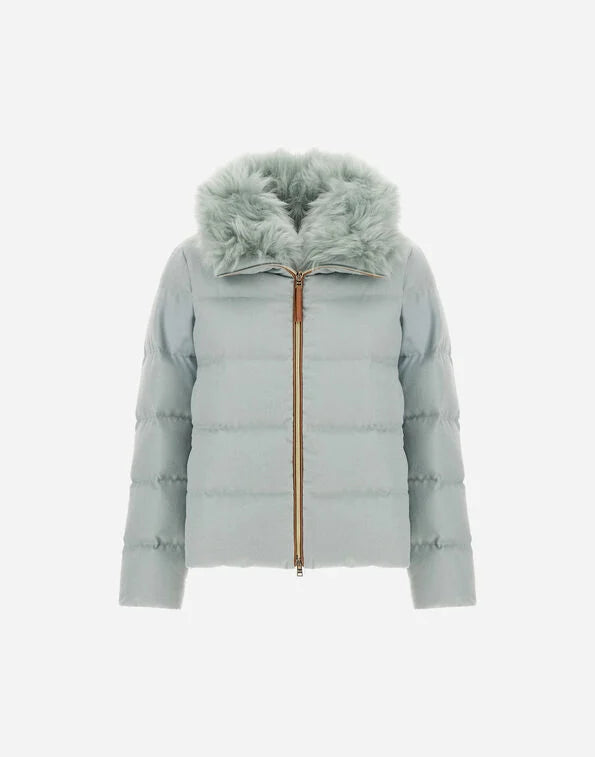 Abrigo de pluma ultraligera de la línea “cashmere & silk” de Herno. Manga larga , cuello desmontable con automáticos y largo a la cadera . Bolsillos laterales con cremallera invisible y cierre frontal con cremallera de doble cursor, ribeteada en cuero . High insulation , gramaje 3 plumas y tratamiento eco whater repelent. Color verde salvia . Composición : 51% seda , 49% cashmere. Cuello de pelo de carnero australiano. Ineterio: 90% plumón de pura oca clase 1, 10% pluma . Tallaje italiano , hecho en Italia . Modelo : PI002151D 38087 7206