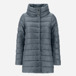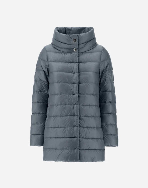 Plumino de oca de la marca Herno color azul grisáceo. Modelo AMELIA. Patrón evasé con acabado brillo, manga larga, bolsillos laterales, cierre con botones ocultos. Composición: 100% Polyamide, 90% plumino, 10% pluma. Ultralight.Gramaje 2 plumas. Tallaje italiano. Ref: PI0505DIC-12017Z-9123