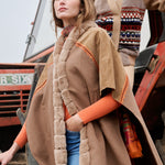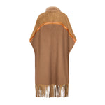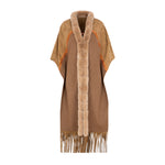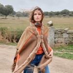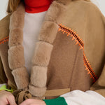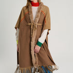 Poncho tipo capa de color camel ribeteada en piel de rex al tono en todo su frontal. Parte superior en ante unido a la parte inferior en lana de Loro Piana con un bordado en hilo de seda natural en color naranja . Remate de flecos de ante de 20cm en la parte inferior.. Composición: 97% Lana de Loro Piana, 3% Angora. 100% Piel cordero.