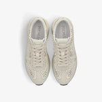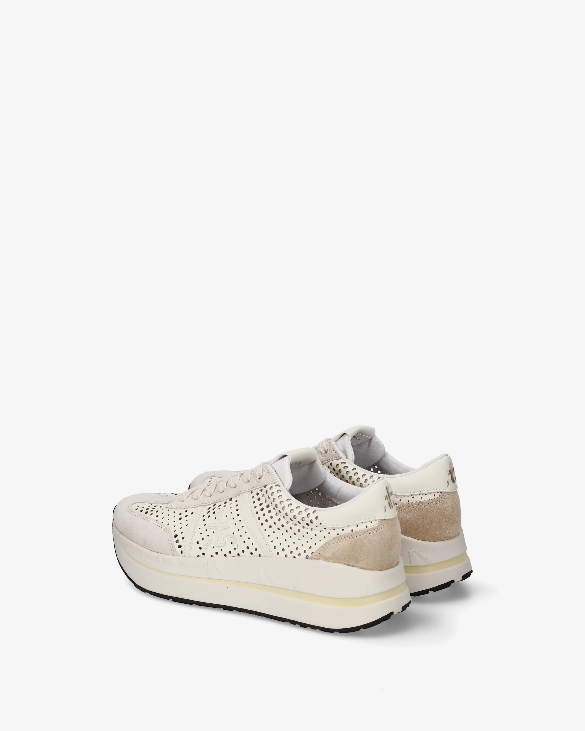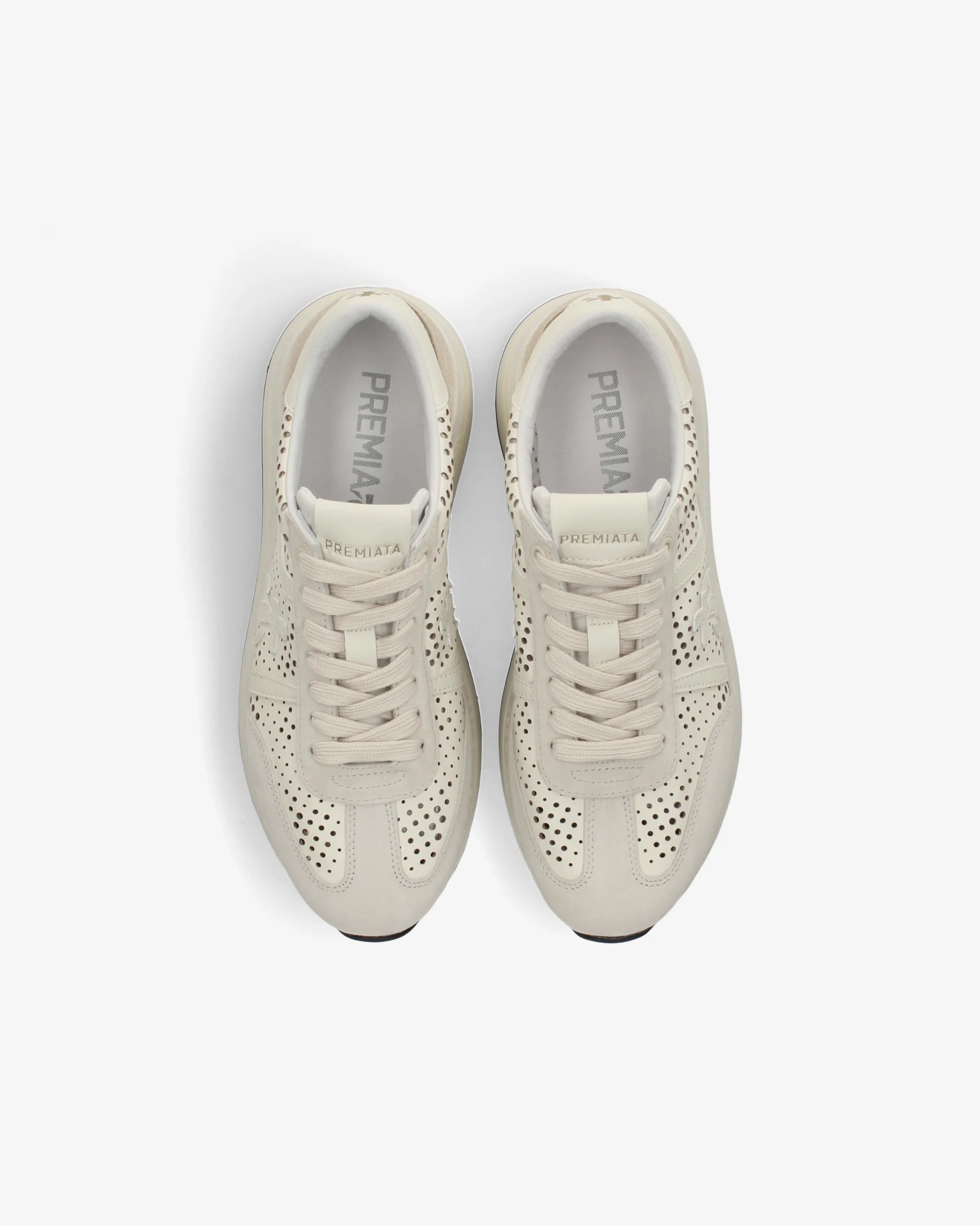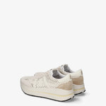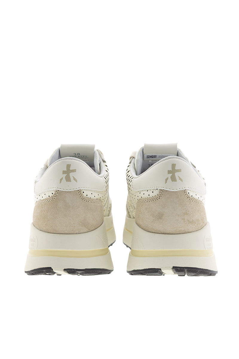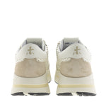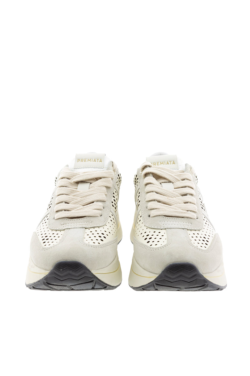 Zapatilla de la marca italiana Premiata en color crudo. Piel troquelada. Puntera y talonera en ante arena en contraste. Plantilla y suela extraconfort.