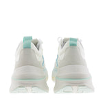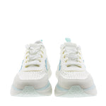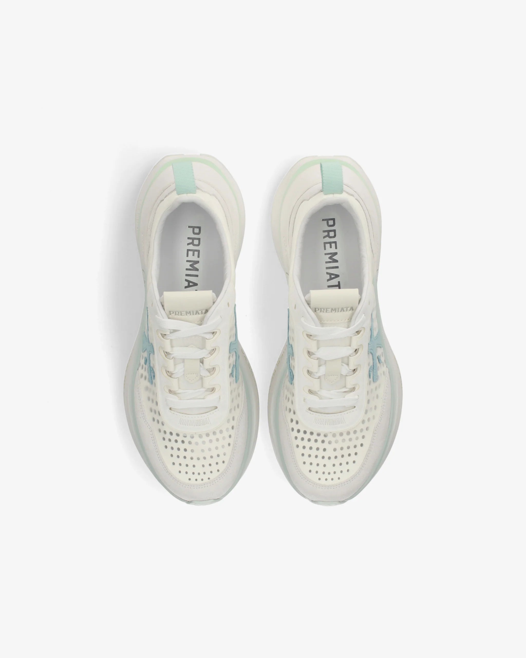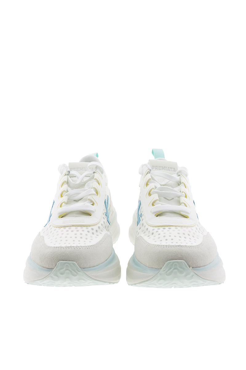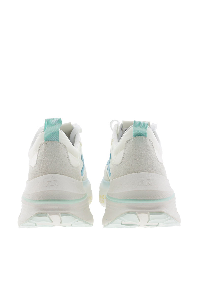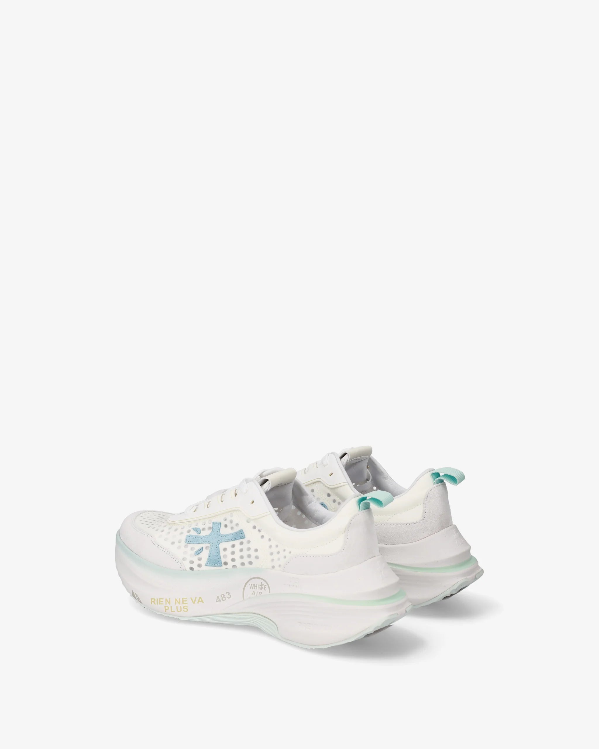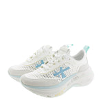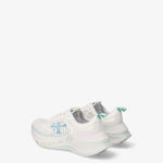 Zapatilla modelo Hill, variante 8243 de la firma Italiana Premiata. Tejido exterior de nylon transparente y troquelado con detalle de logo en turquesa. Puntera en ante blanco y pincelada turquesa en la suela, extra confort.