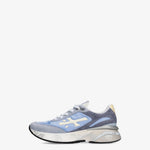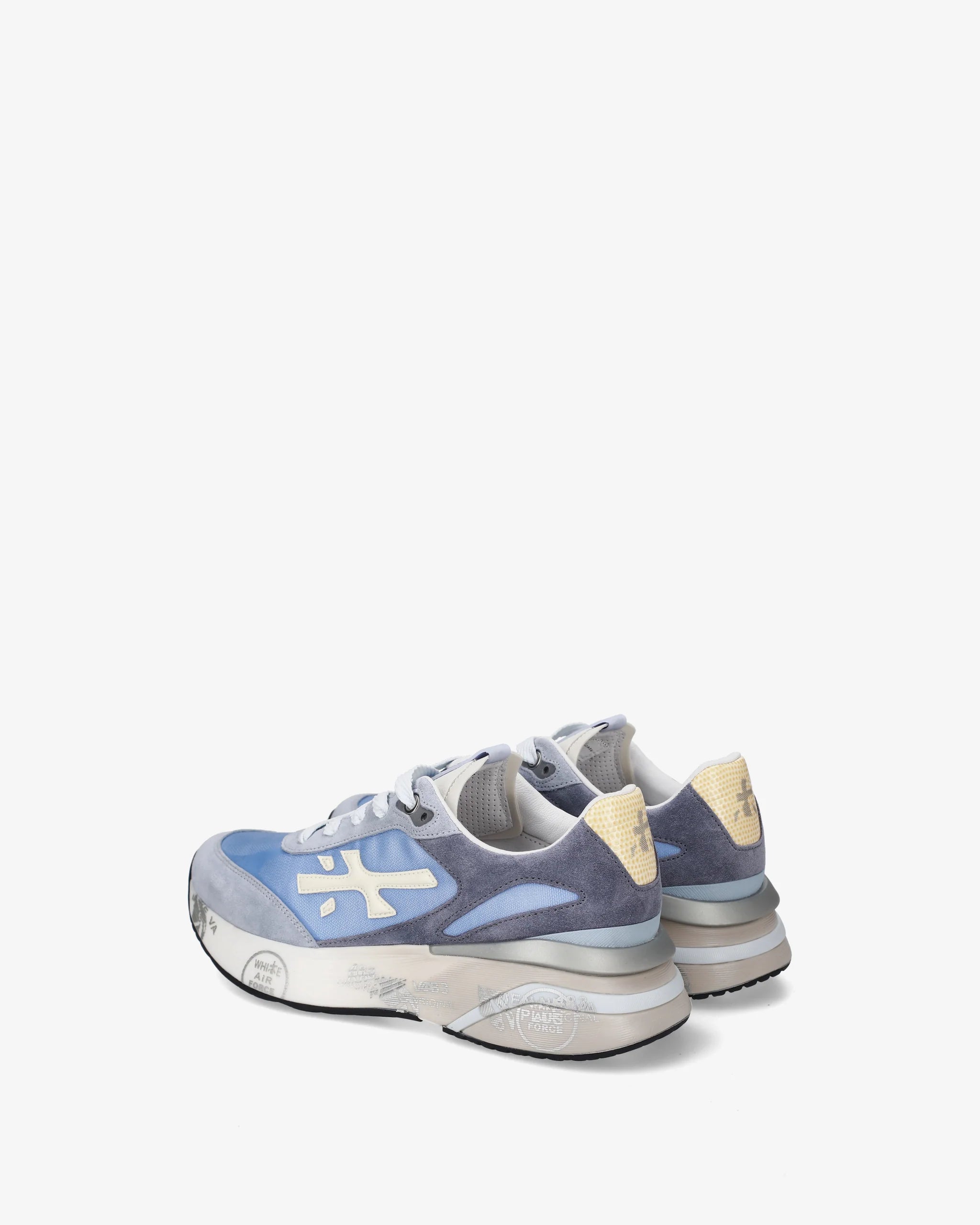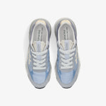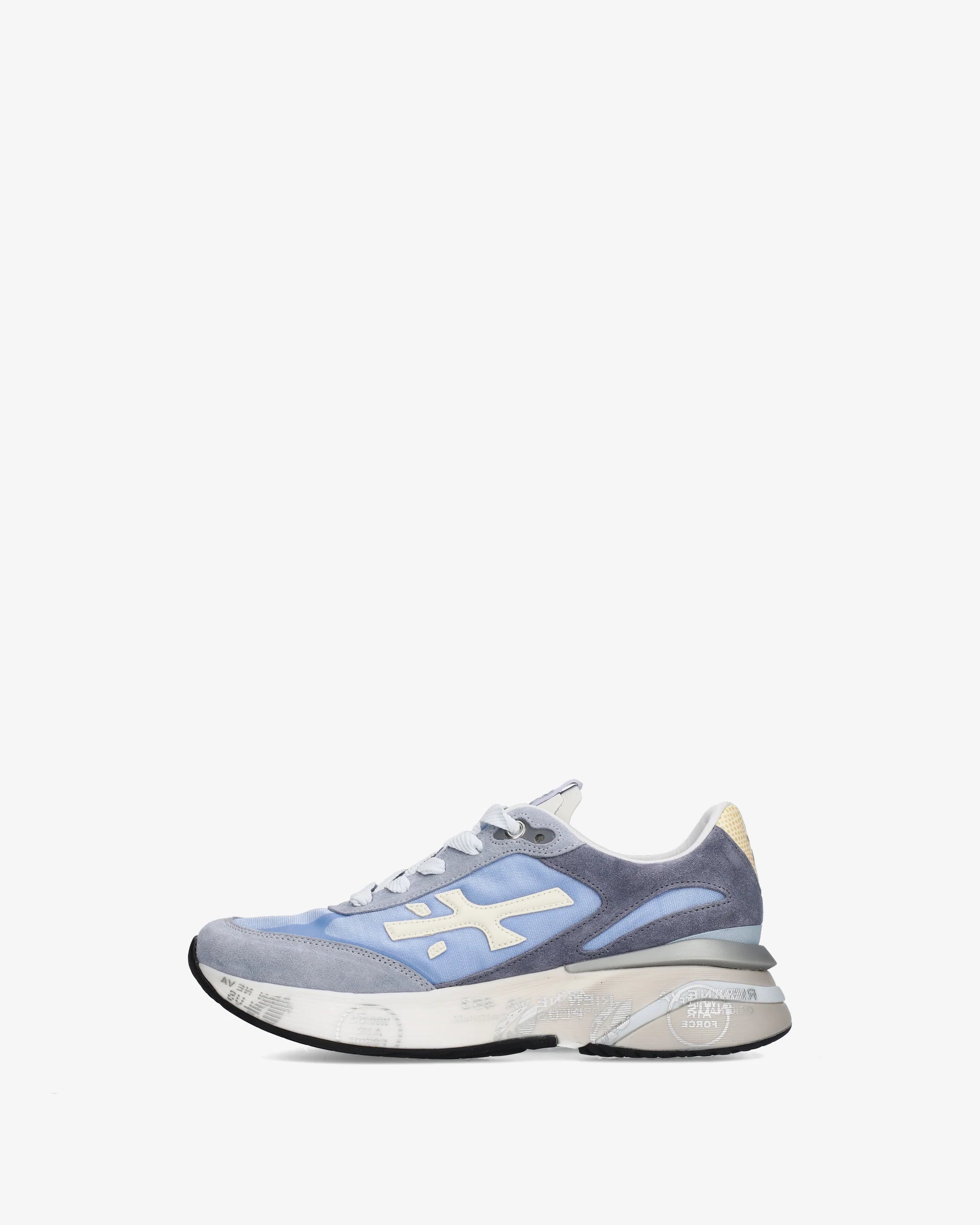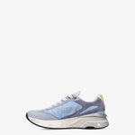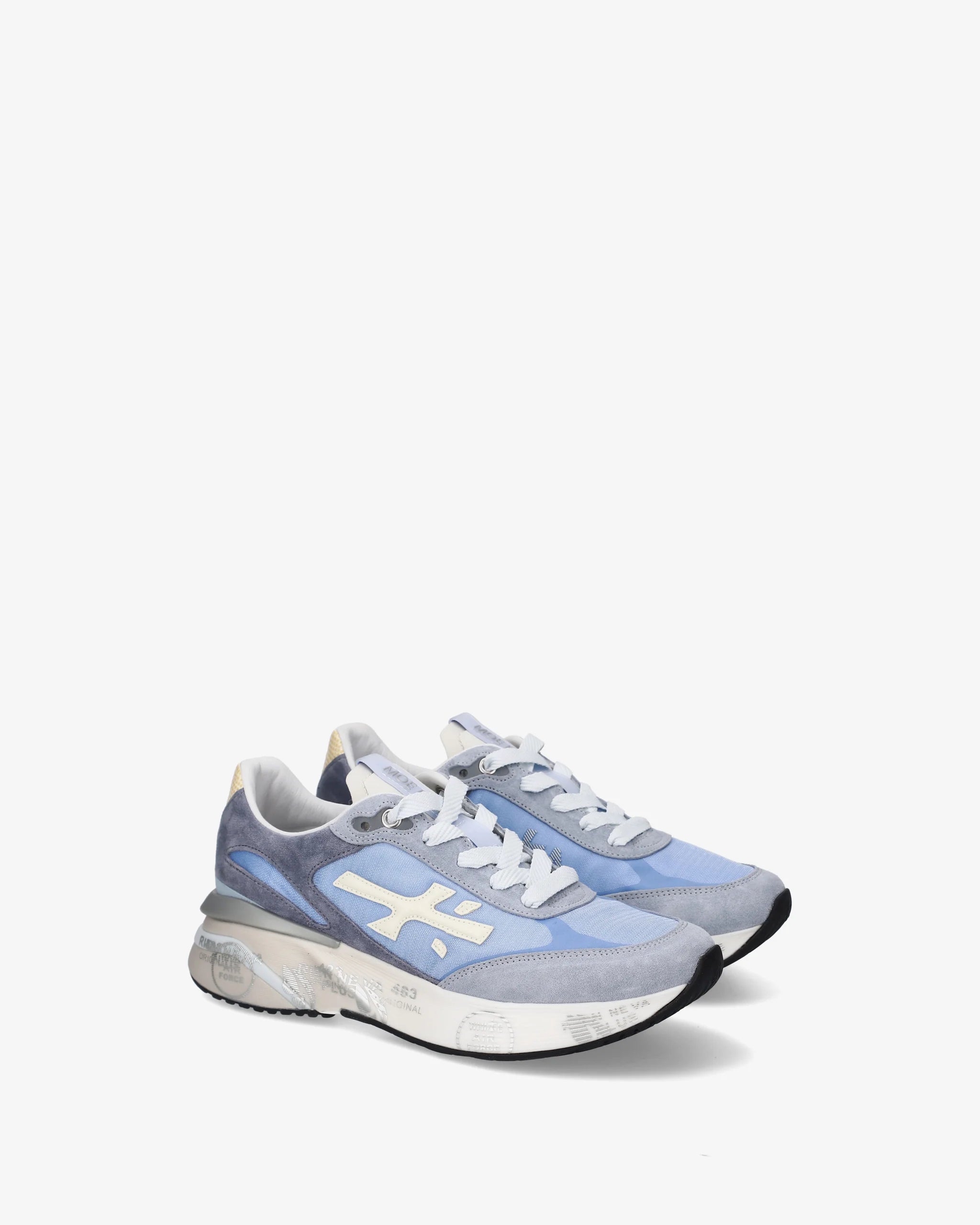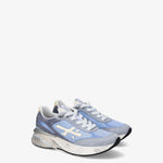 Zapatilla moerund, variante 8082. Tejido exterior en nylon celeste, con puntera y parte trasera en ante gris azulado. Logo y detalle de talón en cuero crema. Suela ancha, extra confort.