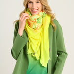 Pañuelo modelo “Quadrello” icónico de la marca Avant Toi celebra el centenario con nosotros con una edición limitada. Pañuelo estilo vintage de punto en cashmere combinado con seda en la parte central. Estampado de flores en tonos naranjas y verdes sobre fondo lima. Una pieza especial para atesorar, perfecta para elevar cualquier look y celebrar 100 años de tradición, calidad y diseño.