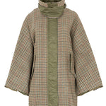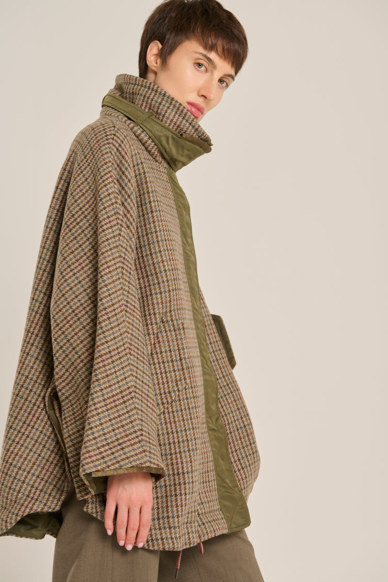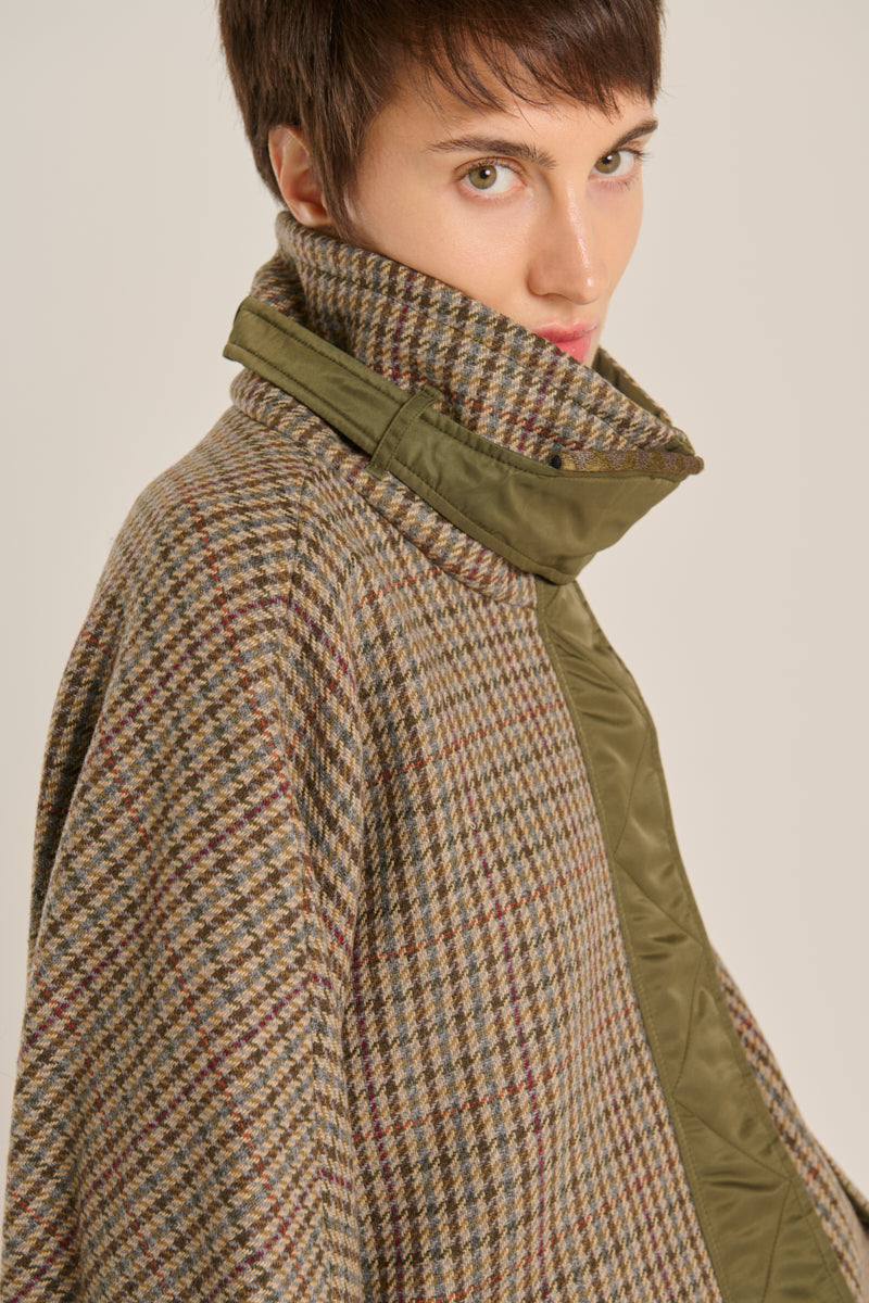 Capa over estilo british. Estampado de pata de gallo en tonos verdes, marrones y tostados. Cierre frontal con cremallera y automáticos. Bolsillos delanteros con tapilla y cordón para fruncir en la parte del bajo. Cierre lateral en sisa con corchetes. Composición: 70% Lana, 15% Poliester, 10% Ploliamida, 5% Otras fibras. Hecho en Italia.