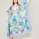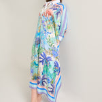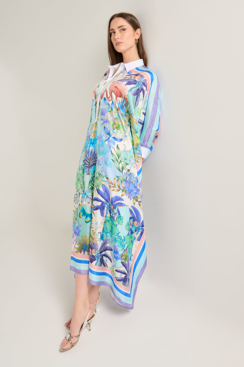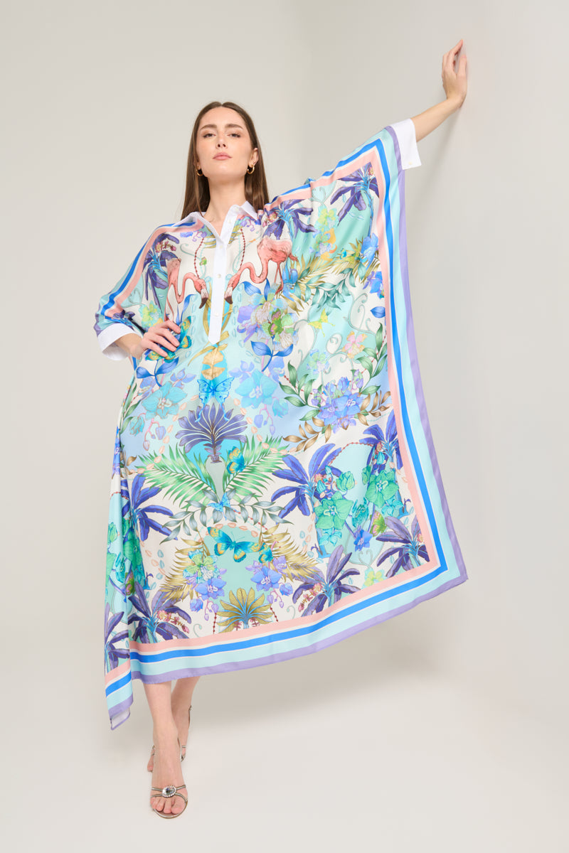 Kaftán kafka de la firma italiana Sara Roka. Original diseño de Kaftán con cuello y puños camiseros, mangas anchas tipo murciélago y costuras laterales para ensalzar la figura. Destaca su estampado vibrante tipo pañuelo donde aparecen flamencos en tonos rosados rodeados de una vegetación exhuberante en tonos verdes y azules. Ideal para climas cálidos. Composición: 100% seda y puños y cuello: 100% algodón. Tallaje italiano. Hecho en Italia.