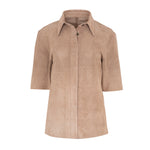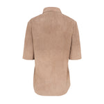 Sobrecamisa de ante de manga corta de la marca italiana Salvatore Santoro. Parte delantera superior perforada y bolsillos laterales. Color tabaco. Composición: 100% piel de cordero.