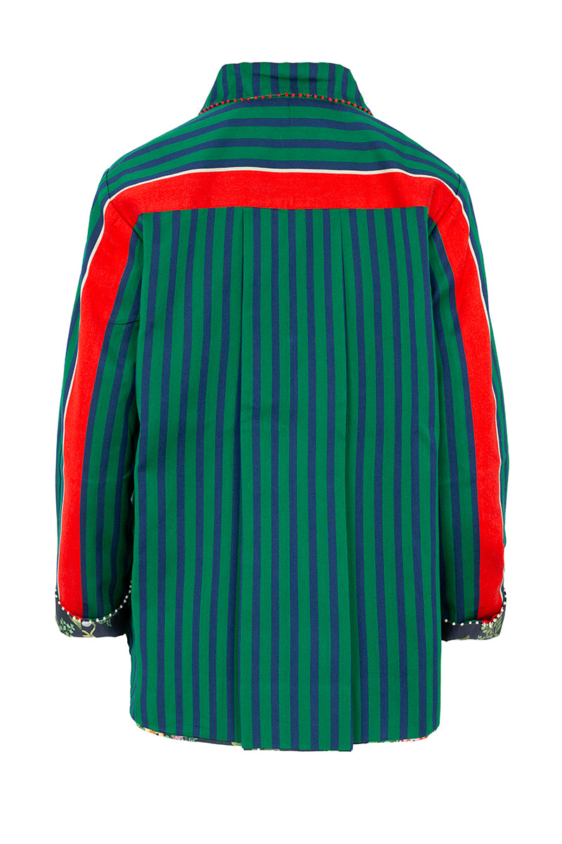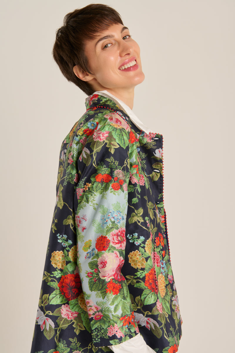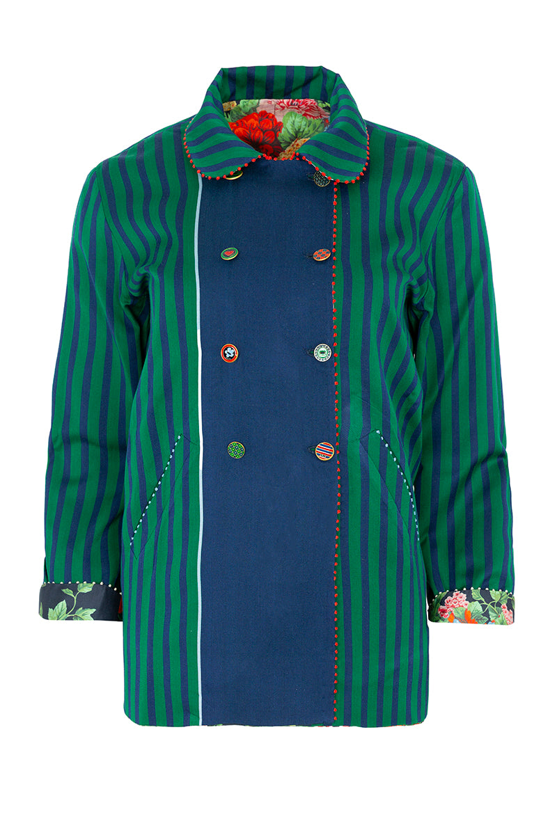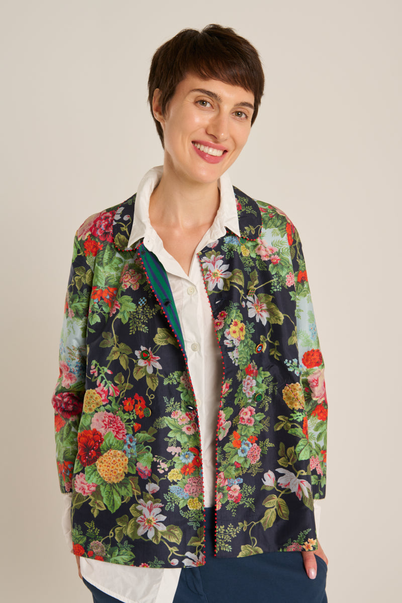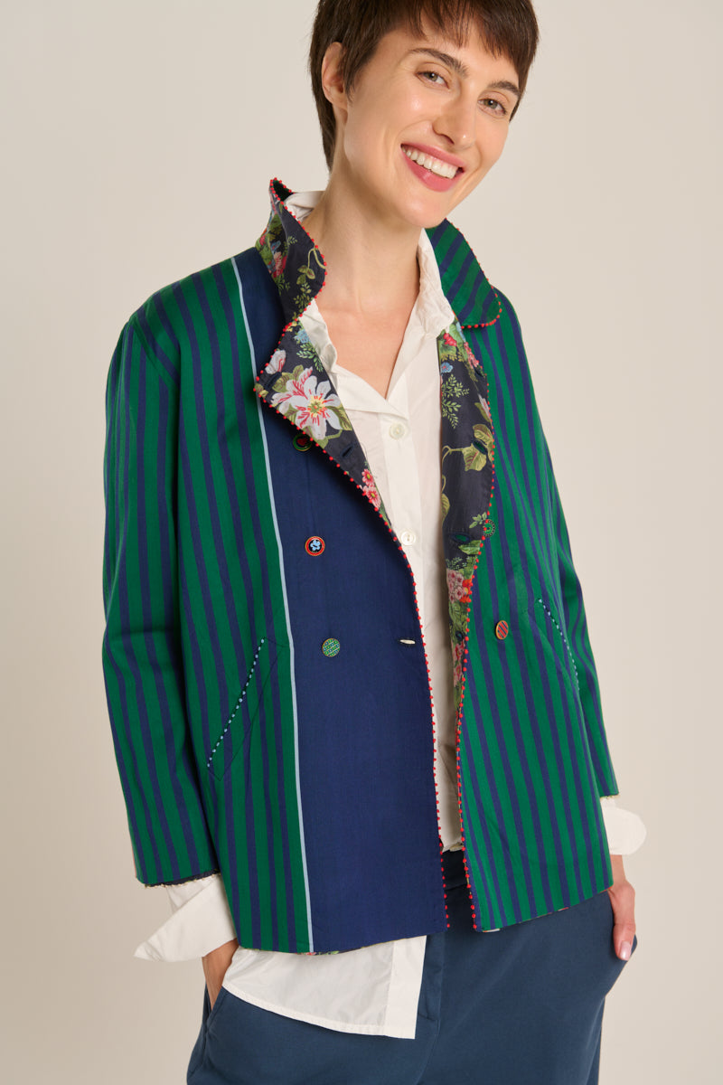 Chaqueta reversible de la marca Péro, con corte evasé, cuello peter pan, delantero cruzado, manga recta, bolsillos invisibles y canesú en espalda de donde sale un tablón encontrado. Más larga por delante que por detrás, contrasta por un lado el estampado floral en tonos verde, rojo, rosa y amarillo sobre fondo azul marino, y por el otro, estampado de rallas horizontales y verticales en tonos verde, azul marino y rojo, con franja central delantera en azul . Detalle de botones joya pintados artesanalmente y ribete de nudo francés hecho a mano, en cuello, filo delantero, bolsillos y mangas. Composición: 100% seda, 100% algodón.