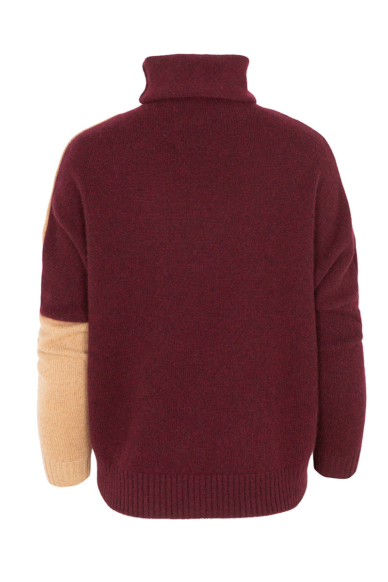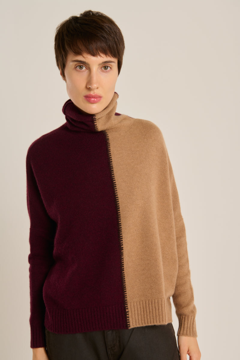 Jersey bicolor oversize de la firma Kujten, en tonos camel y burdeos. Pespunte marrón oscuro en la parte delantera. Cuello vuelto. 100% Cashmere.