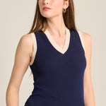 Top de la firma italiana Incotex con ribete en contraste en crudo en escote y hombros. Punto tipo canalé fino no strech. Corte recto. Composición: 100% algodón. Tallaje italiano. Hecho en Italia.
