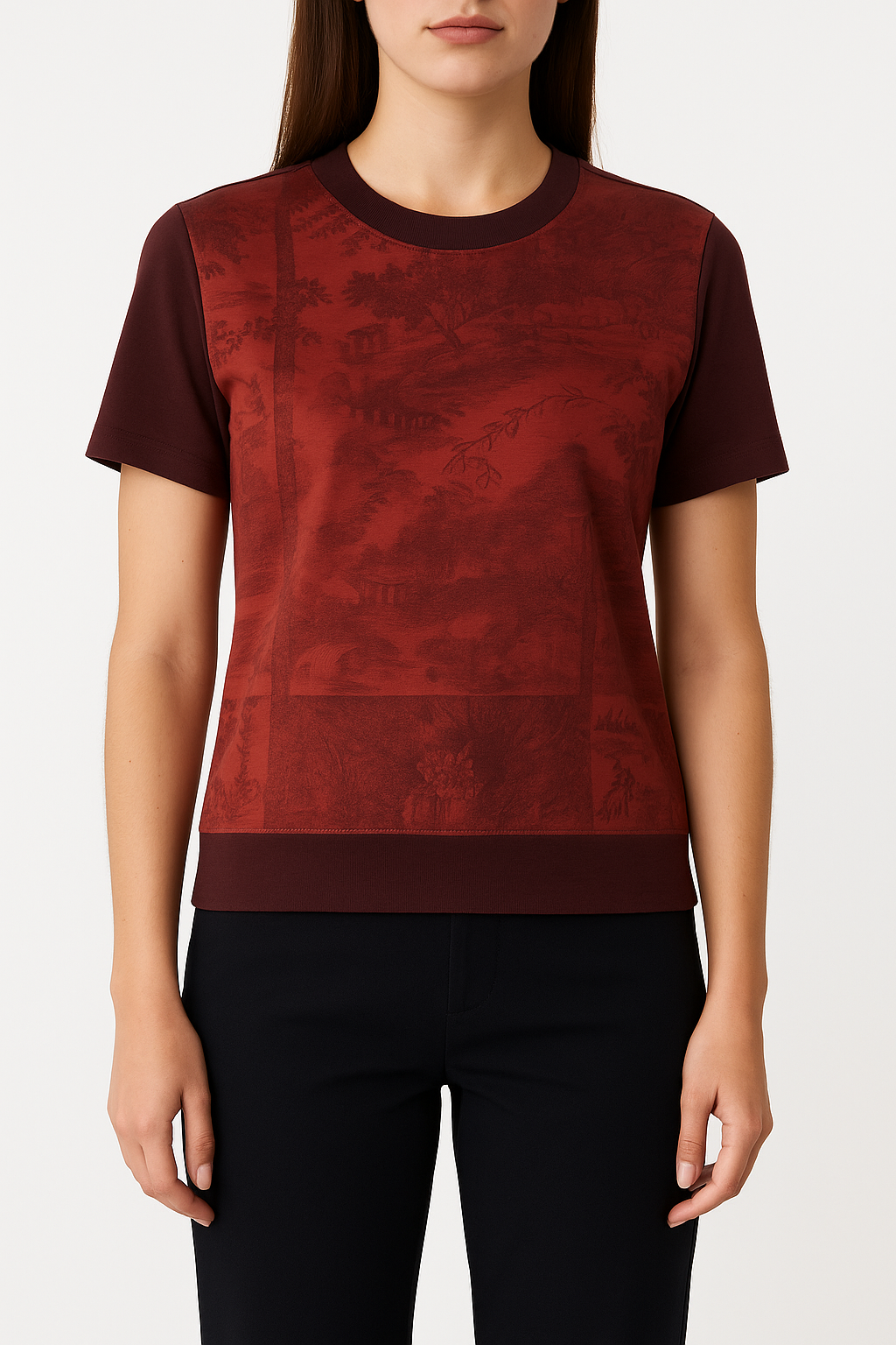 Jersey de cuello caja, manga corta y combinación de seda estampada en delantero y lana en trasera y mangas. Estampado toile de jouy en tono berenjena. Composición: 100% Seda, 100% Lana. Tallaje italiano. Hecho en Italia.