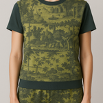 Jersey de cuello caja, manga corta y combinación de seda estampada en delantero y lana en trasera y mangas. Estampado toile de jouy en tono verde. Composición: 100% Seda, 100% Lana. Tallaje italiano. Hecho en Italia.