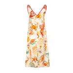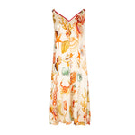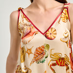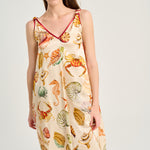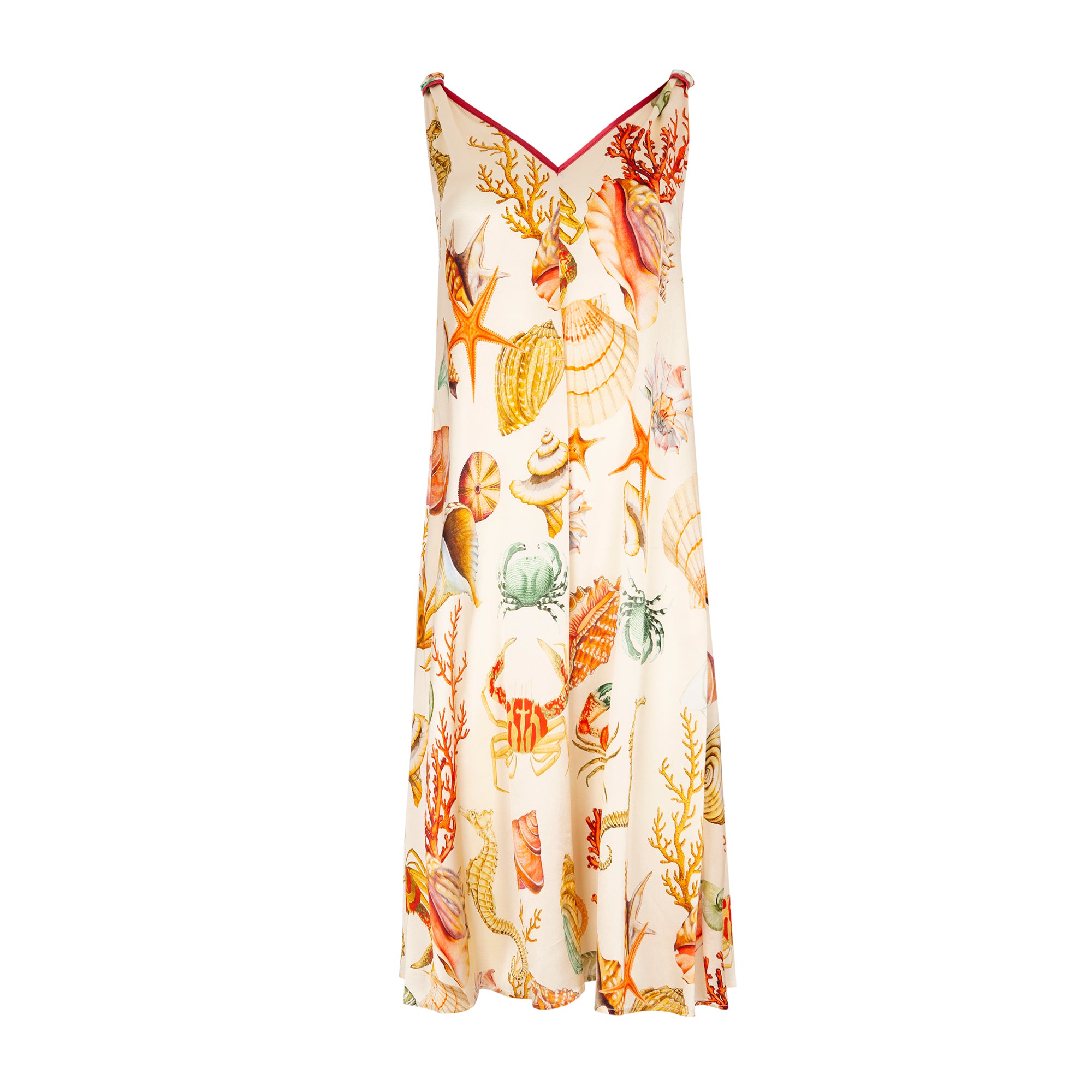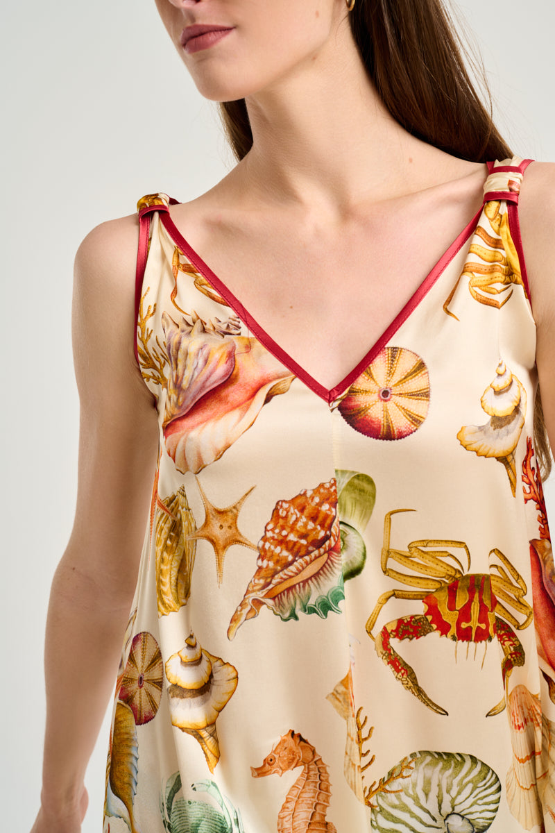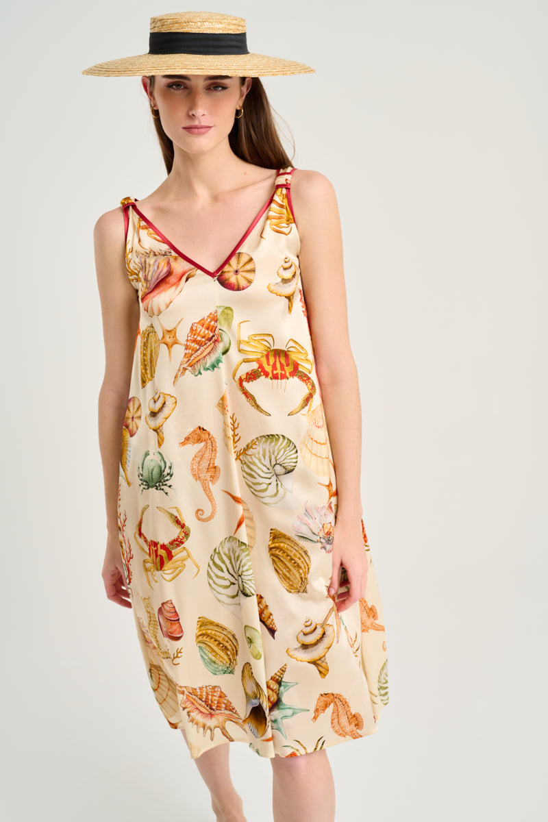 Vestido sin mangas, largo midi, en seda color marfil con estampado fondo marino. Escote en pico ribeteado en tono burdeos. Bolsillo lateral. Composición: 94% Seda 6% Elastano.