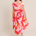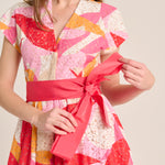 Vestido de la firma italiana Sara Roka de largo midi; en encaje elástico de algodón en tonos rojos, naranjas y rosas. Cuello pico con botones en el frontal. Cuerpo entallado y corte en la cintura con goma elástica en la parte trasera. Falda evasé con tul desmontable en el interior, manga corta. Cinturón en color coral de grosgrain. Estampado floral. Composición: 64% algodón, 36% nylon. Tallaje italiano. Hecho en Italia.