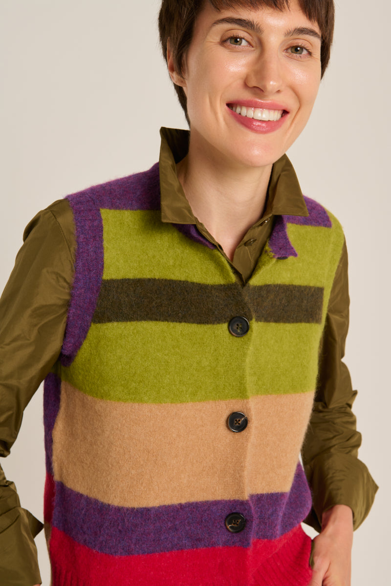 Chaleco de punto a rayas multicolor en tonos verde, beige, morado y rojo. Composición: 73% Alpaca, 25% Poliamida, 2% Elastano. Tallaje italiano. Hecho en Italia.