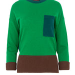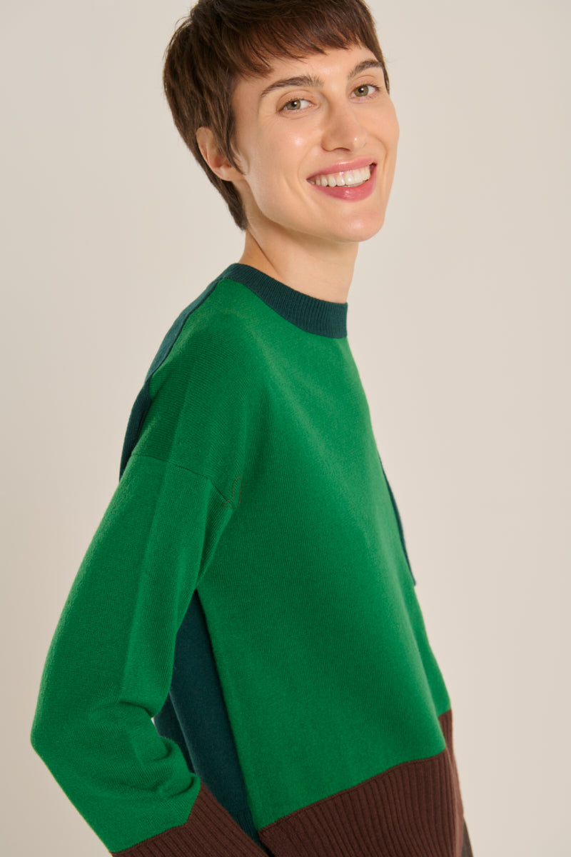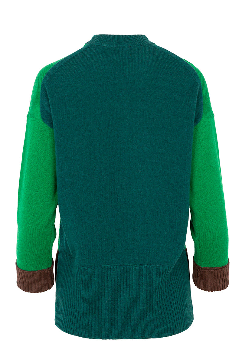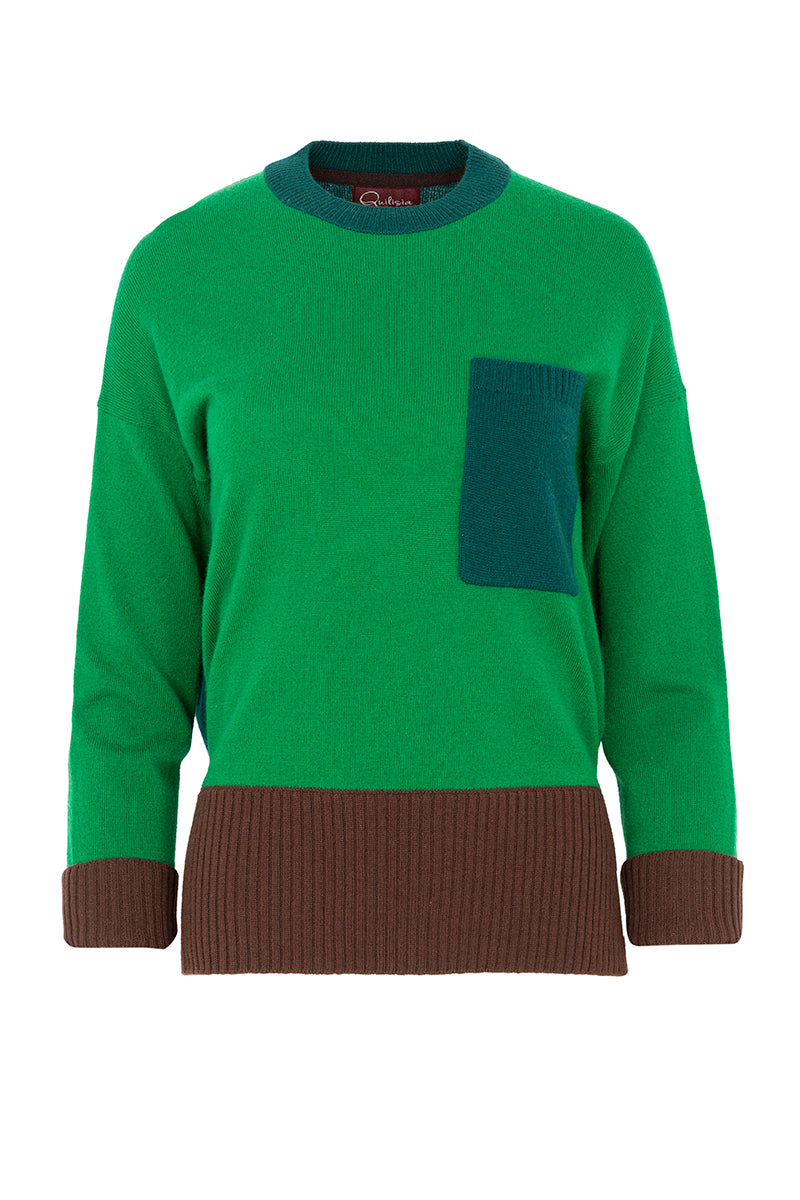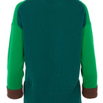 Jersey de punto bicolor de cuello redondo en tonos verdes. Detalle de puños a contraste en color marrón chocolate. Espalda, cuello y bolsillo en verde hoja. Aberturas laterales. Composición: 90% Lana, 10% Cashmere. Tallaje Italiano. Hecho en Italia.