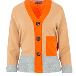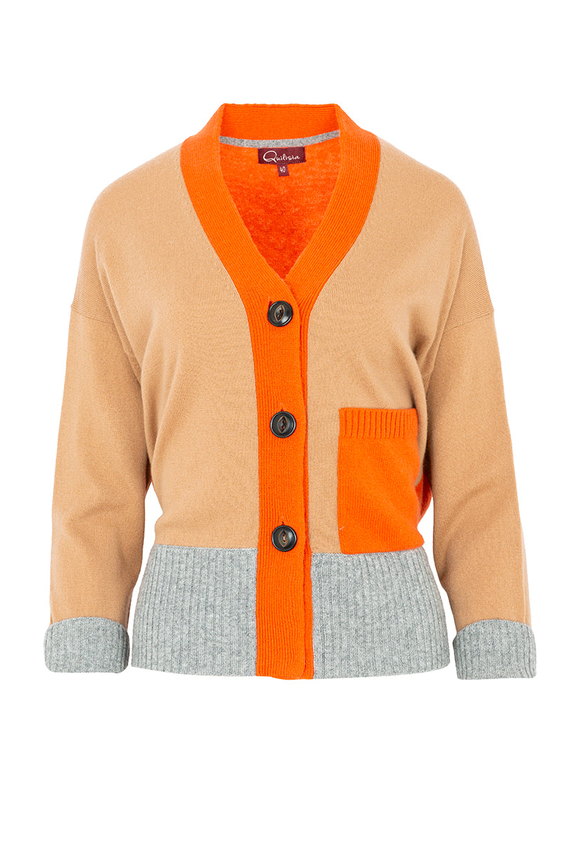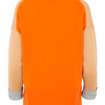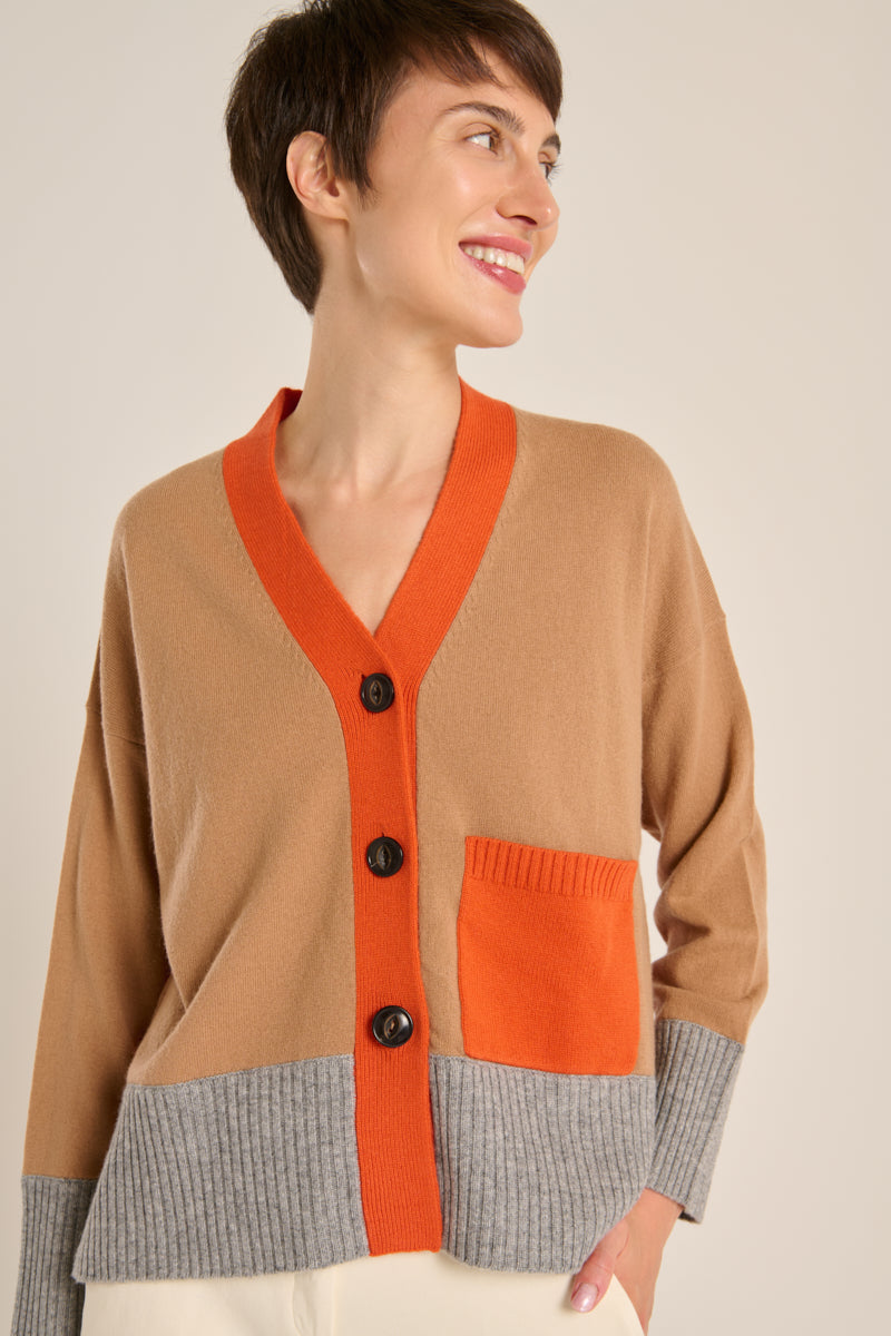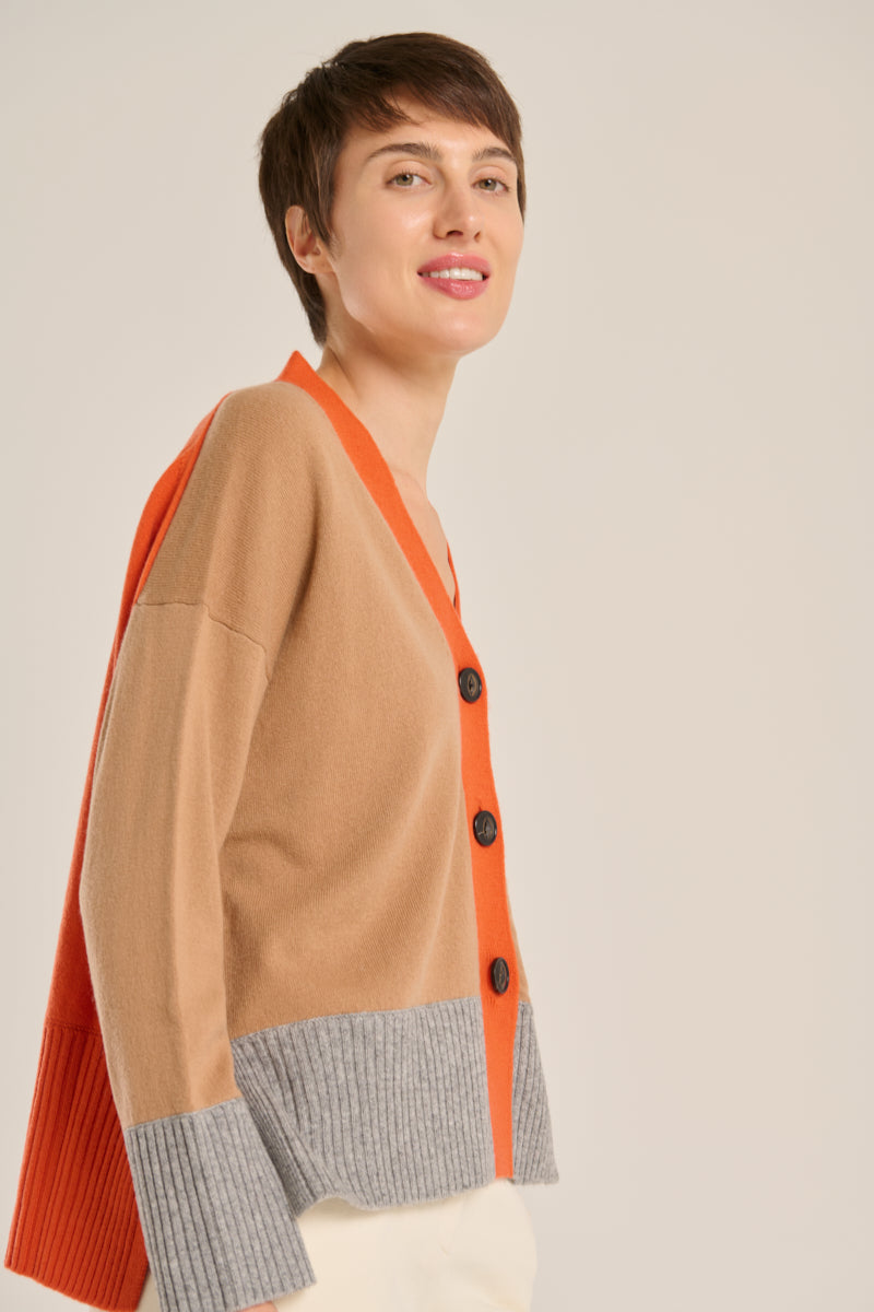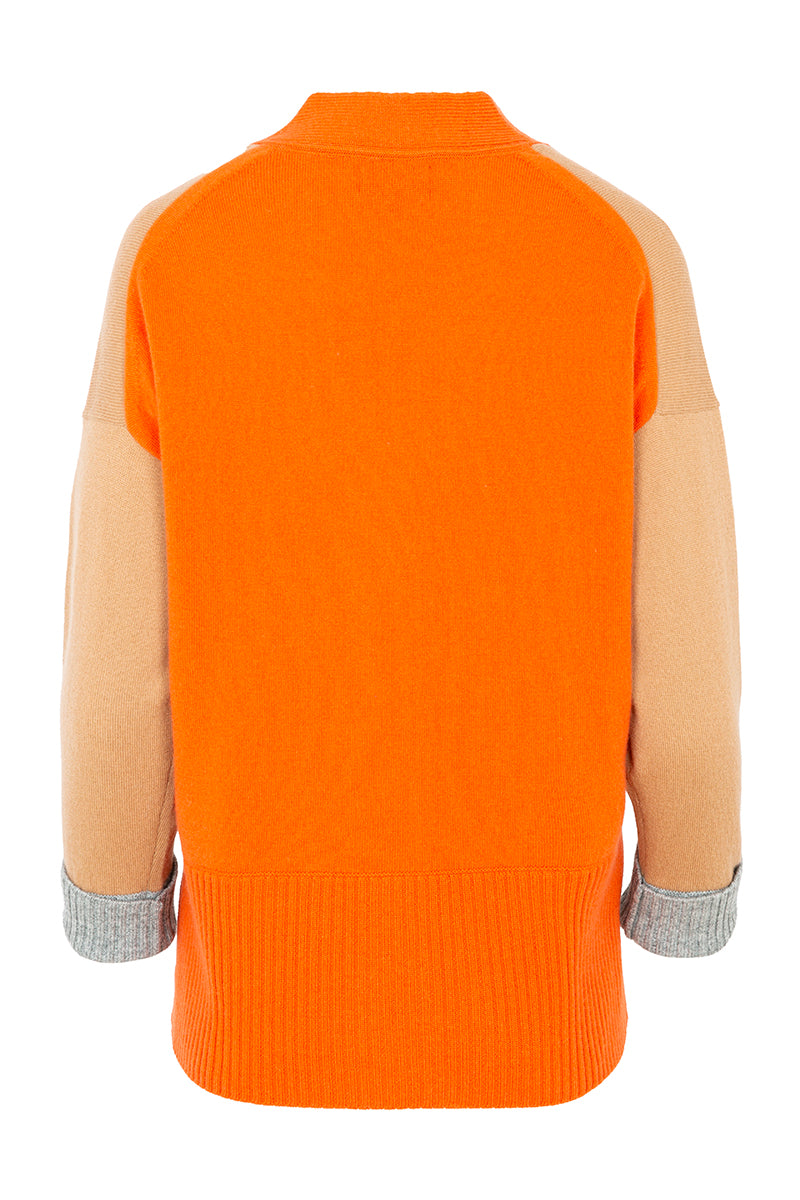 Chaqueta bicolor en camel y naranja, cuello pico, manga larga y asimétrica. Elástico ancho en puño y bajo en tono gris. Aberturas laterales. Composición:90% lana , 10% cashmere.