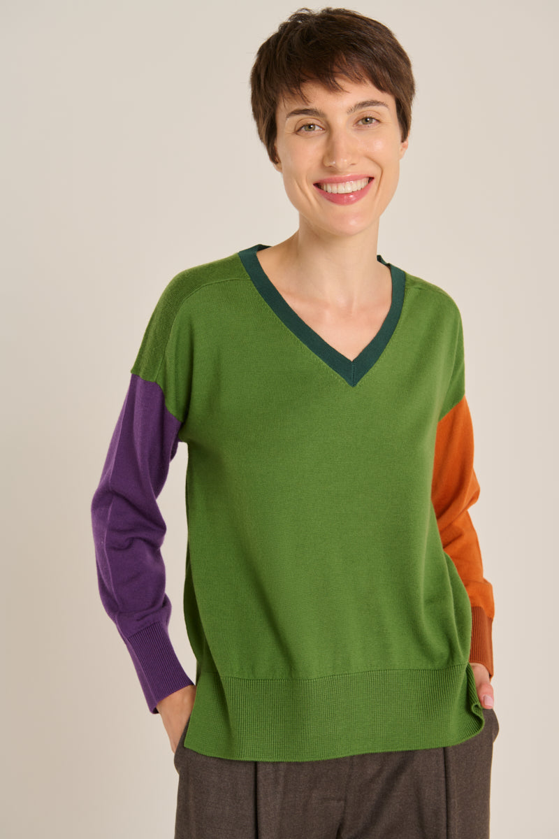 Jersey de punto cuello pico en color verde. Mangas a contraste en tonos caldero y morado y cuello en verde hoja. Composición: 100% Lana Merino extrafina. Tallaje Italiano. Hecho en Italia.