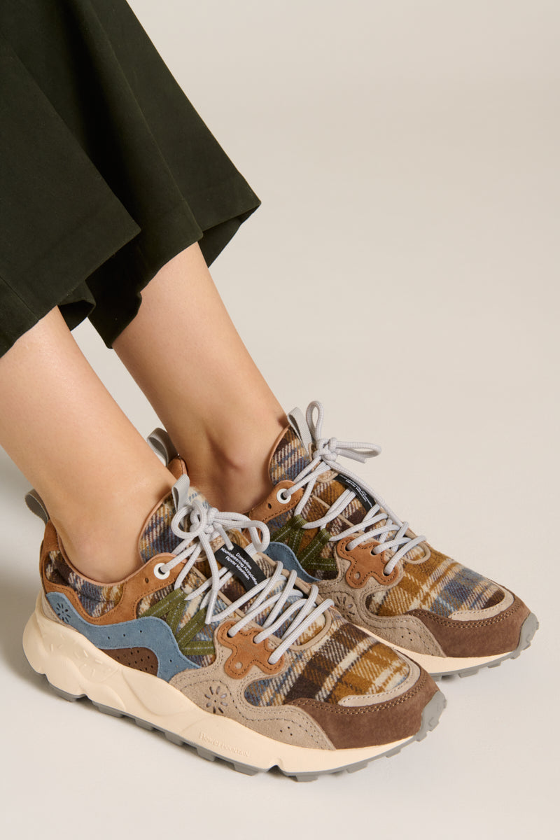 Deportivas de la marca japonesa Flower Mountain. Modelo Yamano 3. Combinación de tela de paño ,en cuadros de tonos marrón, beige, crudo y azul, con ante en los mismos colores . Detalles en gross grain en color kaki y gris. Cordones redondos estilo trekking color gris claro. Plantilla antibacteriana de corcho natural y suela de goma ultraligera dentada.