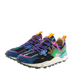 Deportivas de la marca japonesa Flower Mountain. Modelo Yamano 3. Combinación de hilo en lana multicolor sobre fondo negro. Cordones redondos estilo trekking color morado. Plantilla antibacteriana de corcho natural y suela de goma ultraligera dentada en reciclaje beige con pintadas en negro .